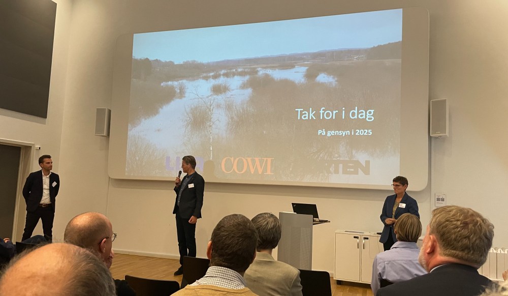 Et spændende indlæg handlende om sikring af Kolding mod fremtidige oversvømmelser, bl.a. ved etablering af en dæmning med sluse på tværs af Kolding Ådal, hvorved store mængder vand kan parkeres midlertidigt i ådalen. Selvom intensionerne er gode, står udfordringerne i kø, og mængden af aftaler og tilladelser som projektet skal fremskaffe, er alenlang. En udfordring er bl.a., at hele projektet bygger på modeller for hydraulik og hyppighed, men ingen kan jo med sikkerhed vide om modeller holder stik. Dialogen med de mange ejere af vandparkeringsarealerne er derfor svær, for hvad betyder det reelt for ejendomsværdien, at en – i forvejen vådt område uden omdrift – oversvømmes i nogle uger f.eks. hvert 6. eller 15. år? En anden stor udfordring i projektet er, at vandet parkeres i områder med beskyttet natur.
