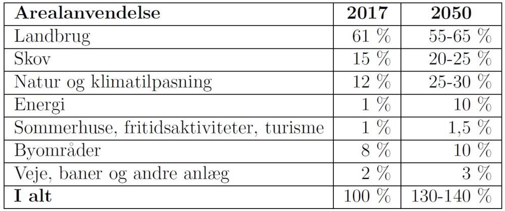 I Danmark er der mange forskellige interesser i forhold til, hvordan landets arealer skal anvendes. Faktisk er der så mange krav og ønsker til arealanvendelsen, at Danmark er for lille et land til at rumme det hele. Problemet opstår, fordi de samlede planer, mål, forventninger og ønsker til Danmarks arealanvendelse allerede ser ud til at ville kræve mellem 130 og 140 procent af landets areal i år 2050 – altså langt mere, end der faktisk er plads til.